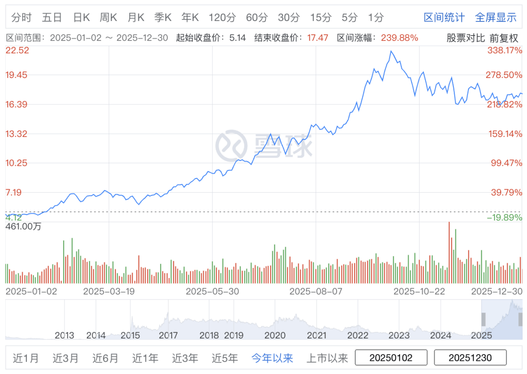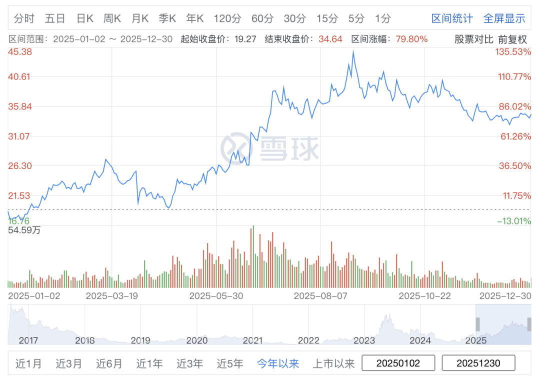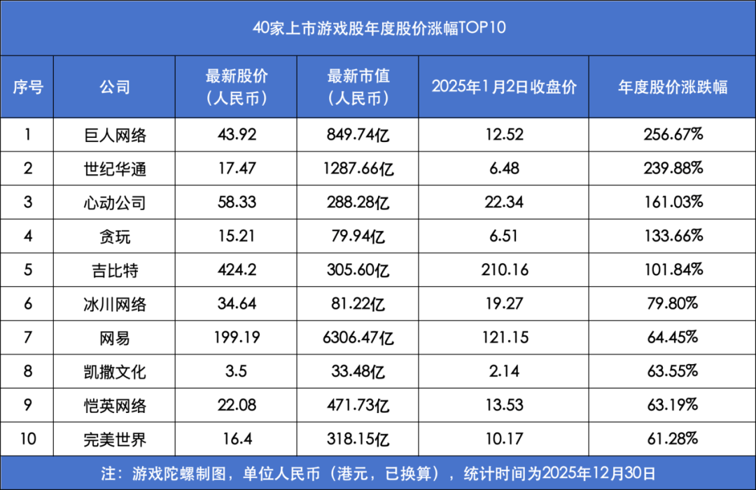 本年2月发布的《Kingshot》预估年收入达3.3亿美元(约23.12亿元),同比增加26.5%,我们梳理了40家逛戏上市公司(A股、港股各20家)的年度股价表示。此中国产版号1676款,同比增加25.07%,网易股价年内最高触及248港元/股,奠基告终实的业绩根本。半年报发布当日涨停,市值大幅缩水。为后续业绩铺。目前收盘34.64元,逛戏陀螺制图(统计时间2025年1月2日至2025年12月30日收盘)